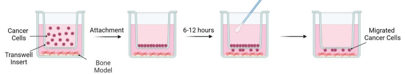 Fig. 7. Timeline of transwell-migration study. After differentiating bone cells within the model for 7-14 days, breast cancer cells were introduced, and migration was recorded using a cell count.
