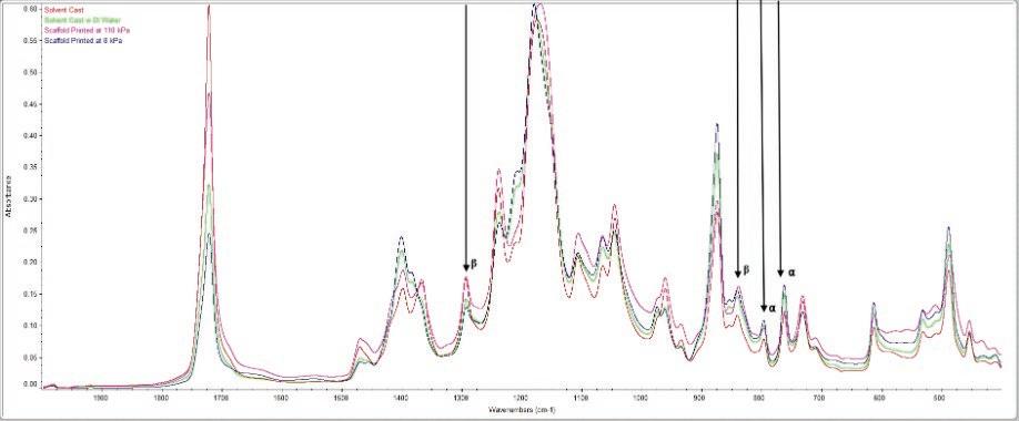 peaks at 1275 cm−1 and 840 cm−1 in Fig. 11. All-trans formation increases the piezoelectric properties of PVDF necessary for creating a biomimetic bone scaffold (Tu et al.). The shear stress caused by pneumatic printing also explains strong beta-phase peaks. High pressures through a small diameter nozzle during fabrication expose the polymer to high levels of shear stress. Shear stress has been shown to increase the beta-phase content of PVDF (Dixon).