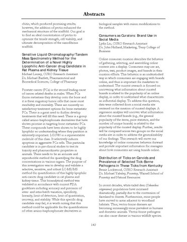 Distribution of Ticks on Cervids and Prevalence of Selected Tick-Borne Pathogens in These Ticks from Kentucky Bessie Lockwood, CURO Research Assistant Dr. Michael Yabsley, Forestry, Warnell School of Forestry and Natural Resources In recent decades, white-tailed deer (Odocoileus virginianus) populations have increased dramatically, partially due to the conversion of farmland to forests. Furthermore, more people have moved to areas adjacent to woodland habitats. Thus, vector-borne diseases are becoming increasingly more prevalent in humans and domestic animals. Vector-borne pathogens can also cause disease in various wildlife species. 143