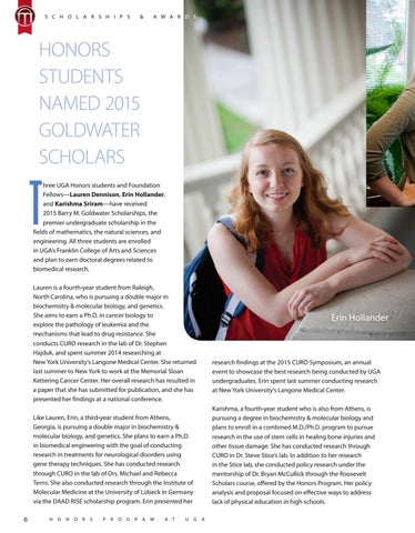 hree UGA Honors students and Foundation Fellows—Lauren Dennison, Erin Hollander, and Karishma Sriram—have received 2015 Barry M. Goldwater Scholarships, the premier undergraduate scholarship in the fields of mathematics, the natural sciences, and engineering. All three students are enrolled in UGA’s Franklin College of Arts and Sciences and plan to earn doctoral degrees related to biomedical research. Lauren is a fourth-year student from Raleigh, North Carolina, who is pursuing a double major in biochemistry & molecular biology, and genetics. She aims to earn a Ph.D. in cancer biology to explore the pathology of leukemia and the mechanisms that lead to drug resistance. She conducts CURO research in the lab of Dr. Stephen Hajduk, and spent summer 2014 researching at New York University’s Langone Medical Center. She returned last summer to New York to work at the Memorial Sloan Kettering Cancer Center. Her overall research has resulted in a paper that she has submitted for publication, and she has presented her findings at a national conference.