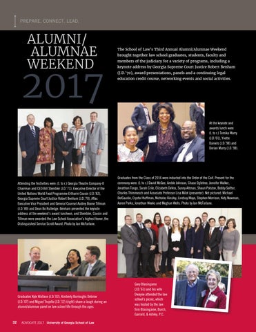 The School of Lawâs Third Annual Alumni/Alumnae Weekend brought together law school graduates, students, faculty and members of the judiciary for a variety of programs, including a keynote address by Georgia Supreme Court Justice Robert Benham (J.D.â70), award presentations, panels and a continuing legal education credit course, networking events and social activities.