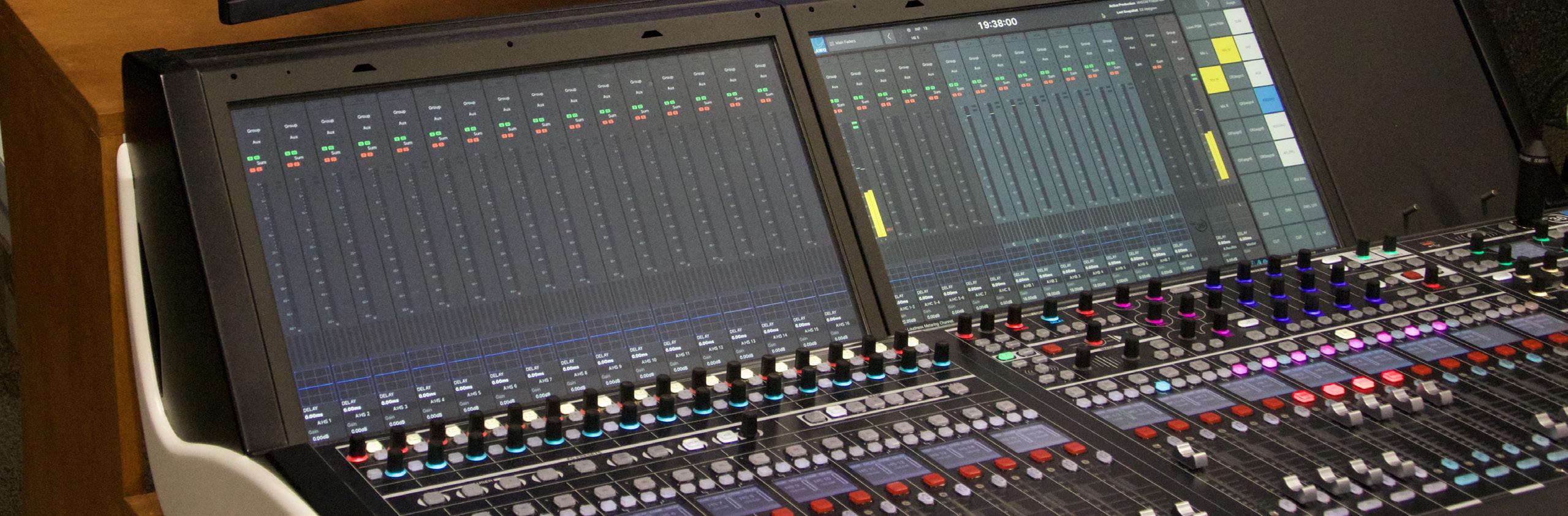 HEADER: Close up of the mixing board in the recording studio.