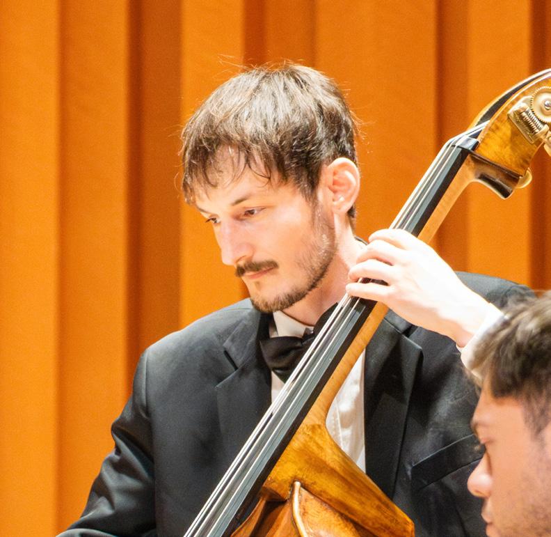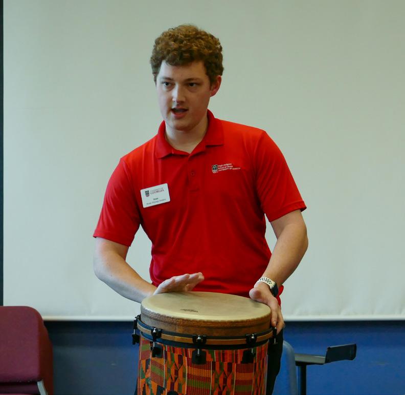Photos top to bottom: Wueliton Zanelatto Dal Pont (DMA ’26) performs with ARCO Chamber Orchestra April 4, 2025. Sean Ferencie (BMus ’26) leads a drum intervention during a Music Therapy practicum on campus January, 2025. Natasha Pizarro (DMA, ’25) performs with the University of Georgia Symphony Orchestra March 28, 2025. Photos by Zoe Lanham.