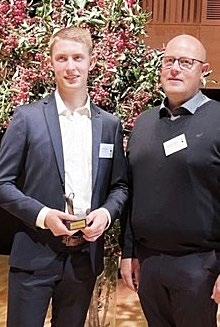 Mesterlærling Mikkel Nygaard Christensen med statuetten og værkfører Søren Christensen til prisoverrækkelsen i København.