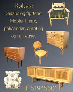 Møbler fra perioden 1930 til 1990. Dansk design, teak, palisander, syret eg, fyrretræ, polstrede lænestole. Kontakt Martin. Tlf: 51 94 56 01