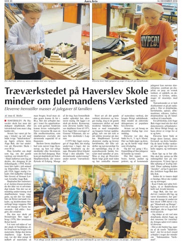 Træværkstedet på Haverslev Skole minder om Julemandens Værksted Eleverne fremstiller masser af julegaver til familien Af Anne K. Møller ■ HAVERSLEV: På Haverslev skole har man det dejligste sløjdlokale, eller træværksted som man i dag kalder det. Avisen har været på besøg i lokalet og talt med både ivrige ”håndværkere” og fagets erfarne lærer, Aage Bak, der har undervist på Haverslev Skole i over 40 år. Han fortæller om sløjd som fag, om det gamle værktøj, om lokalet bl.a.: - Sløjd indførtes som fag på skolen, der dengang lå på Jyllandsgade, i 1954. Inventaret blev købt i juli måned og følgesedlen, dateret 16. juli 1954, ligger stadig i lokalet. Det indkøbte værktøj blev leveret af firmaet Lervad, fortæller Aage Bak. Sløjdsalen blev indrettet i et af skolens klasseværelser, da der ikke var et selvstændigt lokale. Når der var almindelig undervisning stod sløjdbænkene langs væggene, og når der var sløjd, blev de flyttet ind midt i lokalet, og skolebordene blev anbragt langs væggene. Det er der mange af byens nuværende - lidt ældre - borgere, der erindrer. Da den nye skole på Strandvejen blev taget i brug i 1976, blev inventaret flyttet hertil. I et rum ved siden af var der plads til brædderne, eller hvad man nu brugte som materialer. Ifølge den første sløjdlærer, Låge Konnerup, var der ikke penge til indkøb af materialer, så