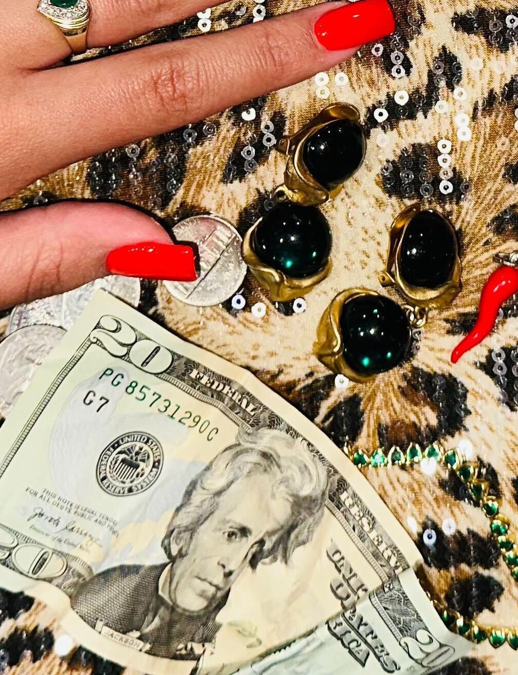 In line with the financial theme, “these photos were inspired by the ‘Mob Wife aesthetic.’ Mob wives are known for their flashy and gaudy fashion choices, so I used cheetah print, gold jewelry, long nails and money to emulate this,” said Anastasia Rivera.