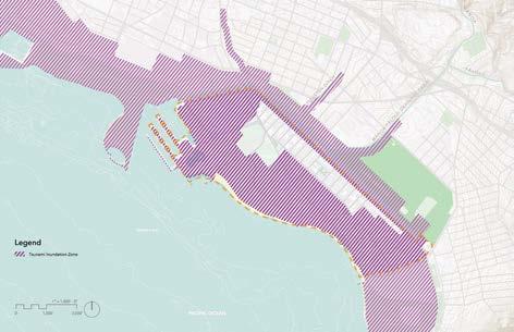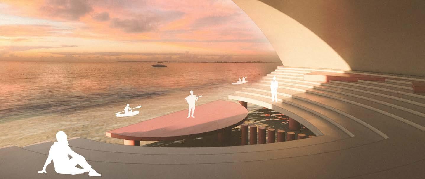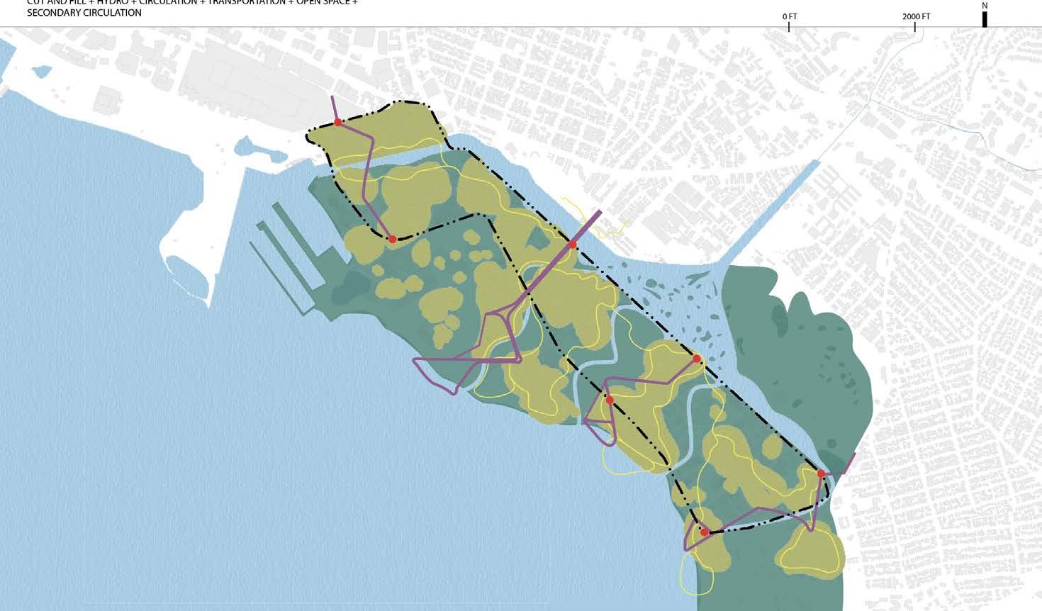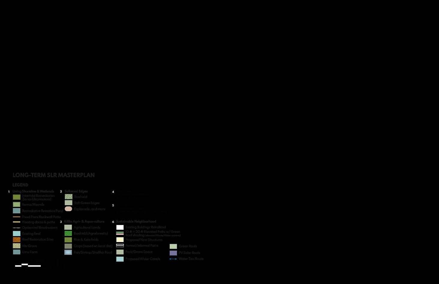 Student concepts explored locale-appropriate, nature-based climate adaptation practices and opportunities for amphibious, blue-green infrastructure in both near-term (3-ft SLR, anticipated ca. 2050 for the purposes of this studio) and long-term (see above) visionary and bold illustrative urban design proposals. The essential drivers of urban form in these forward-looking, speculative visions will be multi-modal, non-automobile connectivity, multi-purpose coastal infrastructure systems, linked public hybrid open spaces, networks of ecological priority zones, and locale-specific, layered living shoreline systems as “nature-based” defense mechanisms against sea level rise and flooding, allowing for indeterminacy, increased biodiversity, improved ecosystem services, and, at the same time, education, decolonization, cultural restoration, and the creation of accessible urban waterfront amenities for all people.