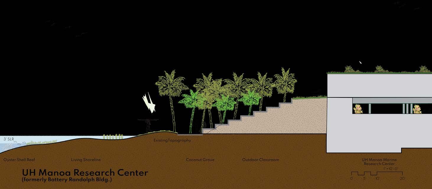 By repurposing the Battery Randolph building to create a connection to UH Manoa and creating an outdoor classroom for students, residents, and tourists to learn or experience the ‘new’ water’s edge