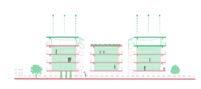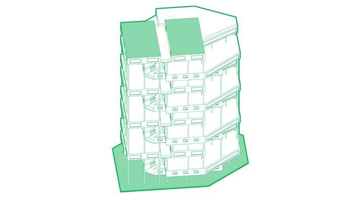 New construction for residences is offered in urban voids, increasing density and walkability, following the same building strategies with advancements.