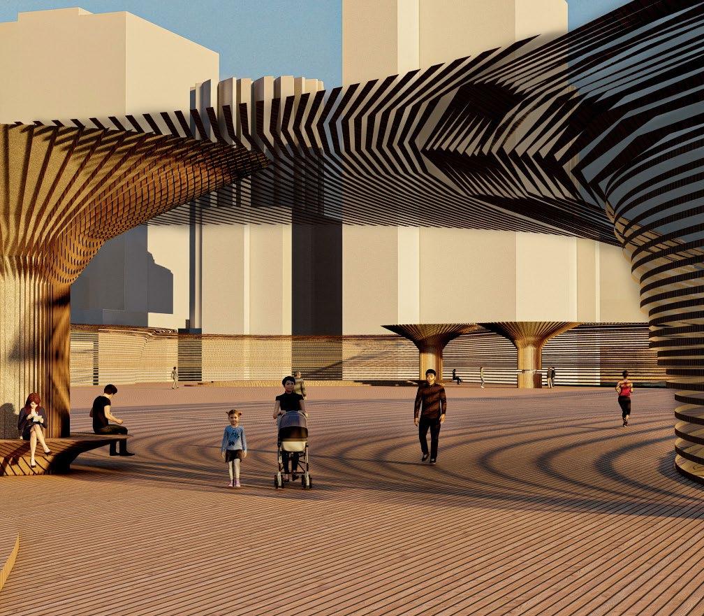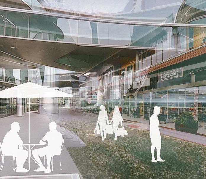 The proposed deck allows for pop-up restaurants, outdoor markets, cultural events, community engagement, and connection to the elevated residential paths.