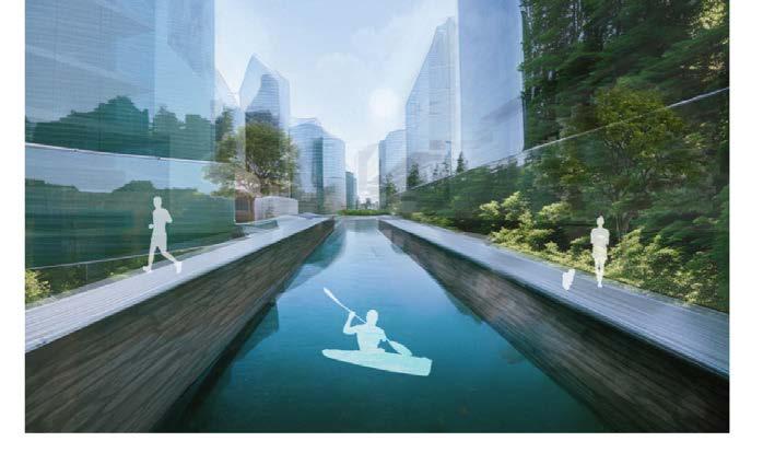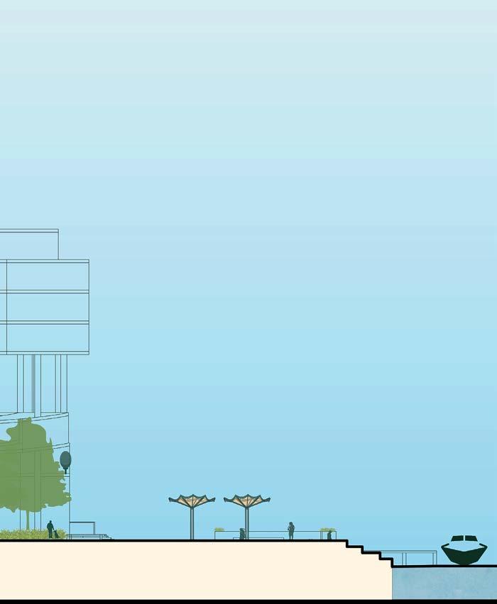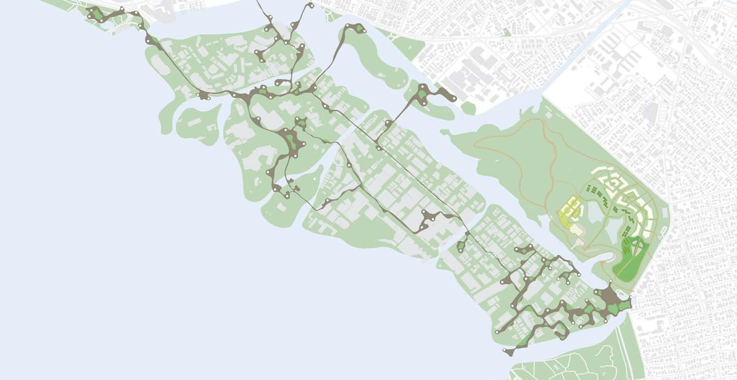 Forests, gardens, constructed wetlands, plazas, green roofs offer a green, biophilic experience at the human scale. Street sponges are first introduced, permeating the hardscape as a way to direct and filter stormwater run-off and mitigate impacts from SLR.