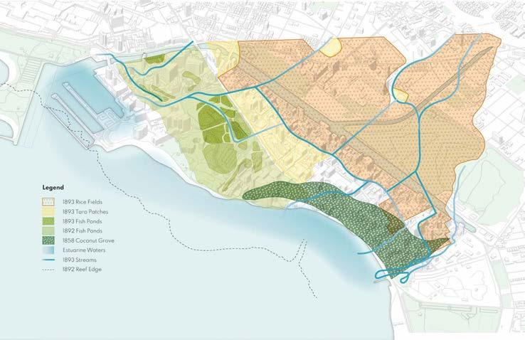 As mentioned above, the class focused on the Waikīkī Special District and its immediate urban context. Pre-development, the studio project area (also see page 3 above) was part of a drainage basin characterized by springs, streams, such as Pi’inaio Stream, and swamp land. Pre-Western contact, the ‘Ewa end of Waikīkī was part of the Hawaiian community of Kalia. It was characterized by numerous traditional fishponds (loko i’a) and residences owned by native Hawaiian royalty In addition to the fishponds, the marshy area in the vicinity of present-day Waikīkī was charachterized by wetland taro farms (lo‘i kalo) and rice fields. In 1908 the U.S. military acquired, drained, and filled a large parcel of land for the subsequent construction of Fort DeRussy.
