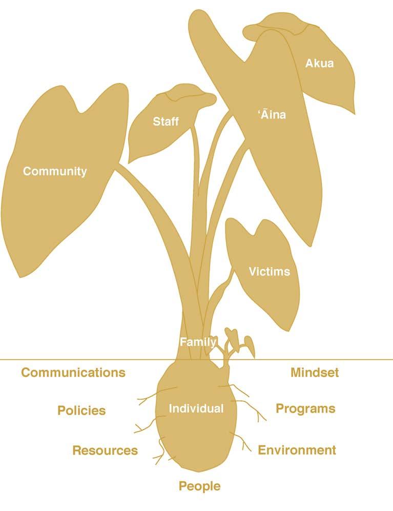 These concepts informed the development of 9 broad Design Principles, intended to guide design at all scales, including programmatic, site, building, interiors, graphic, or other forms of design that shape how a new facility is experienced. These emerged from conversations about a new jail, but are applicable to correctional facilities in general. The principles relate to safety, trauma-informed and healthcentered approach, relationships, ‘āina, strengths, empowerment, culture and identity, learning, and respect.