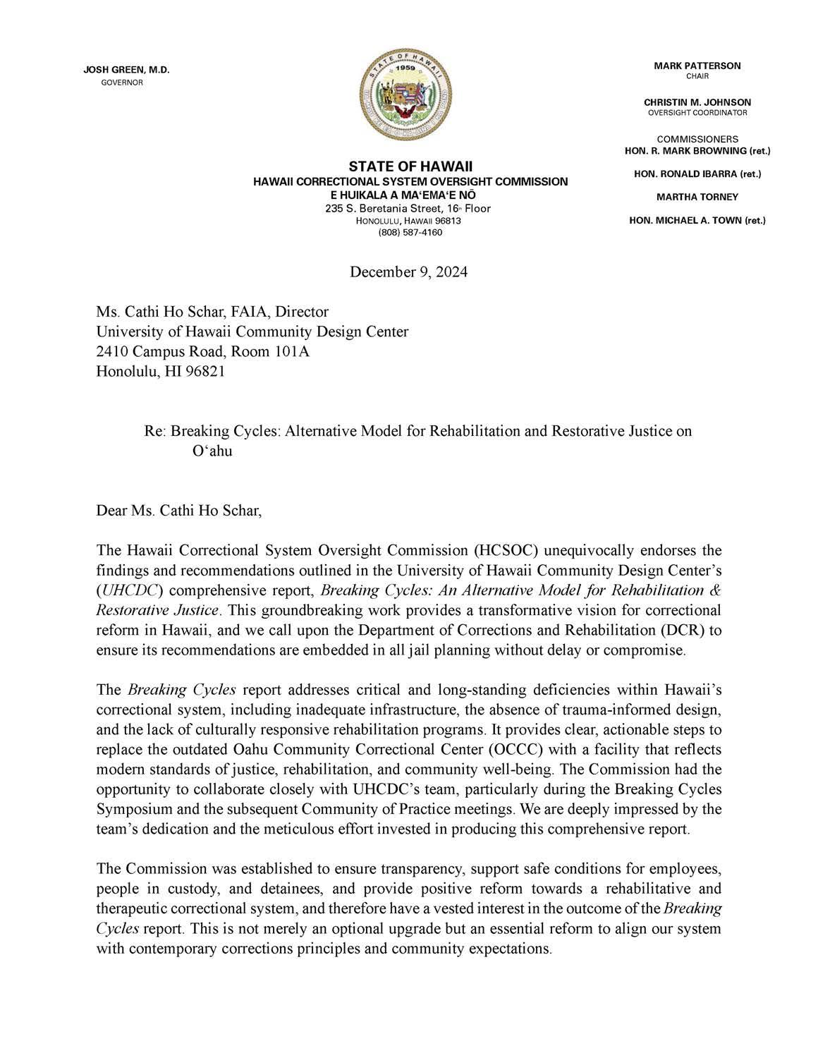 Correctional Reform Working Group: Bob Merce, Mike Livingston, Hayley Cheng; Community Alliance on Prisons: Kat Brady; Habilitat: Jeff Nash and team; Ke Ola Mamo: Eugenie Naone and team; Loko Iʻa Paʻaiau: Kehaulani Lum, Uncle Bruce; Makana O Ke Akua: Jon Dudoit, Keoki Dudoit, and their residents; Prison Reform Hui: Paula Morelli, Patrick Uchigakiuchi; State of Hawaiʻi Governor’s Office: Michael Champion, Annie Valentin, Terrance Cheung; State of Hawaiʻi Correctional System Oversight Commission: Christin Johnson, Cara Compani, Chair Mark Patterson, Honorable Mike Town, Honorable Ron Ibarra, Martha Torney; Try Think: Tammy Jones, Robert Chang; Waikīkī Health: Francine Dudoit and team; YWCA: Noriko Namiki and team