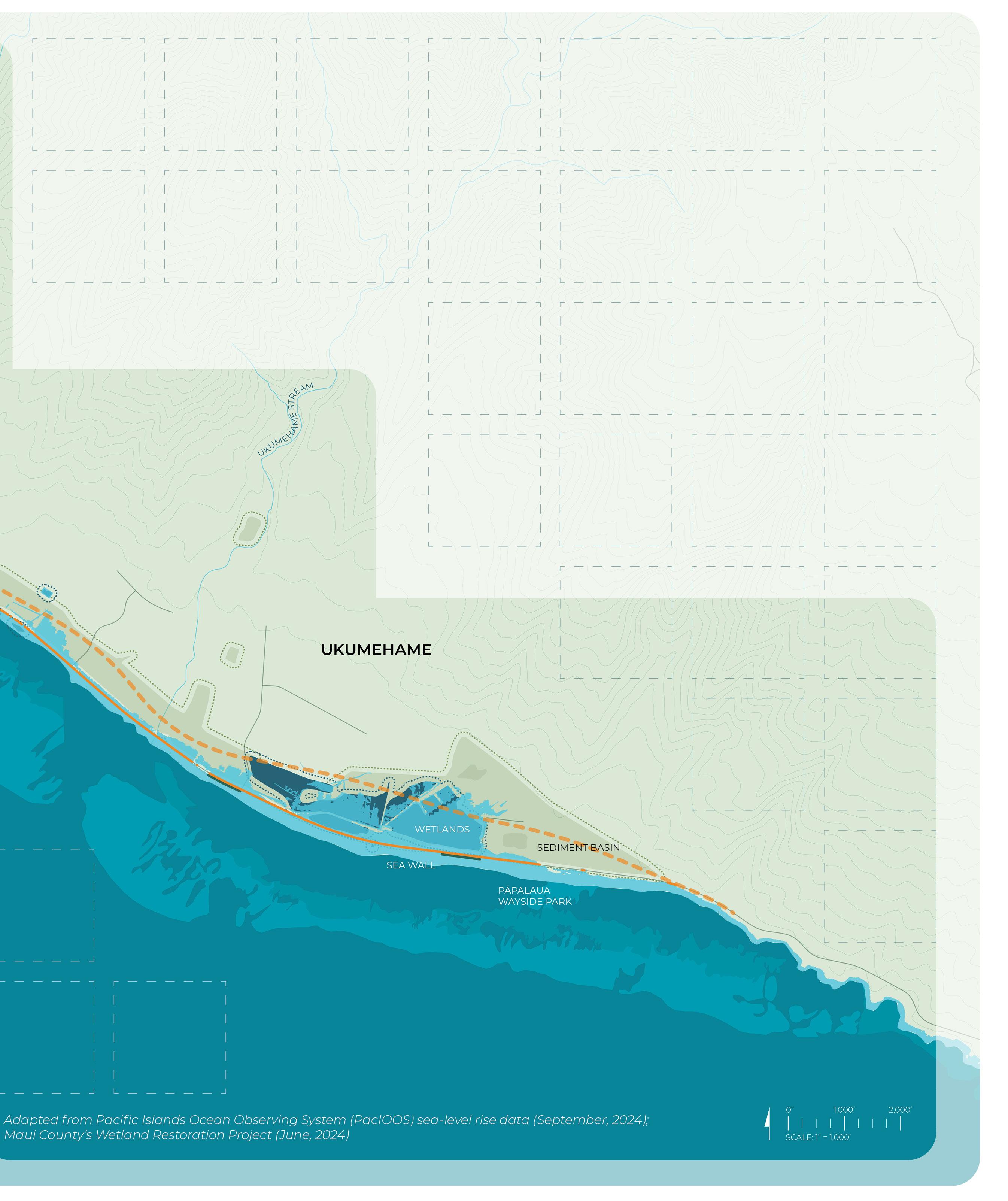 Remove sea wall west of Papalaua Wayside Park, create layered living shoreline systems, turn old highway into elevated boardwalk, and (re)establish salt marsh.