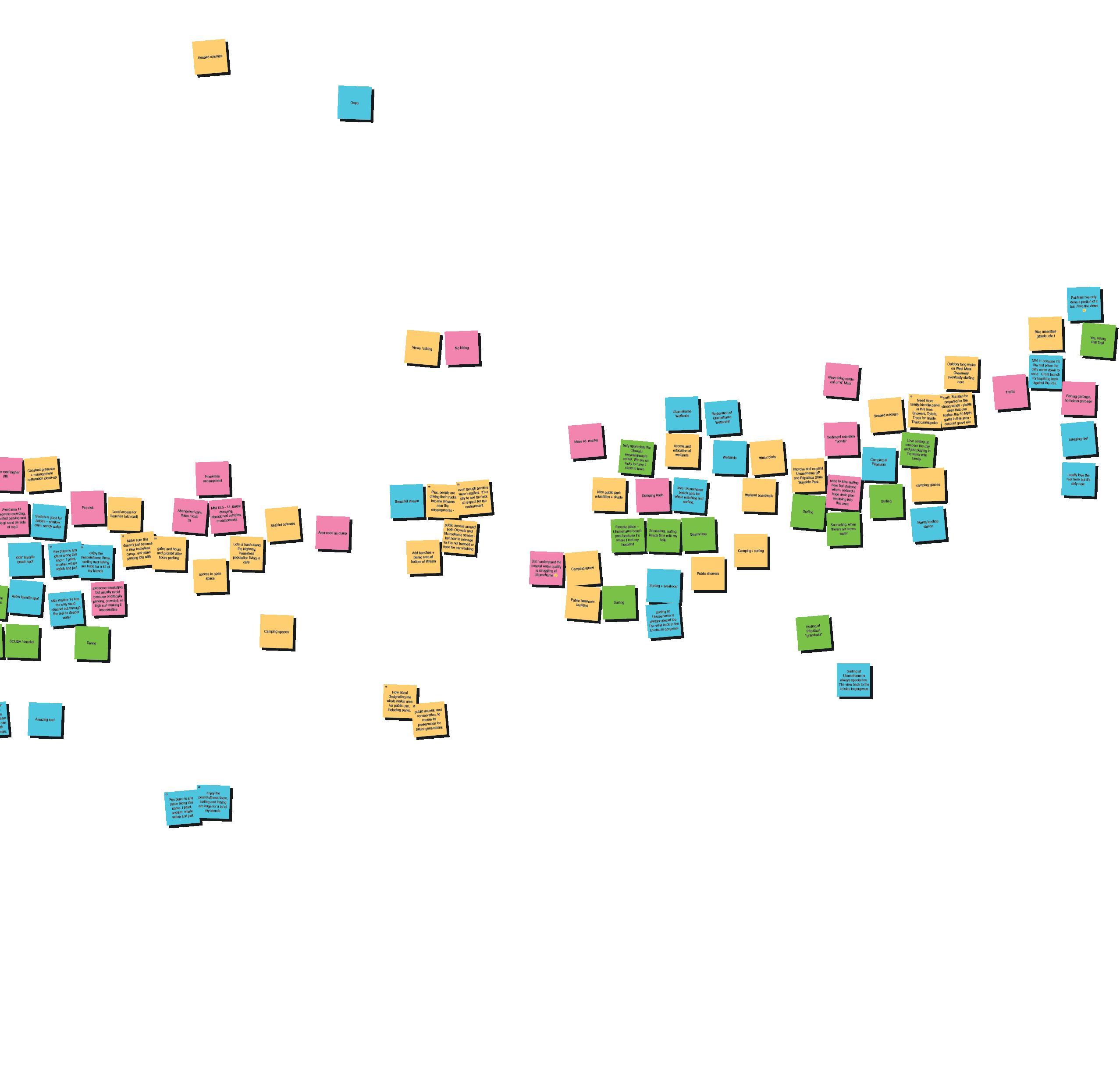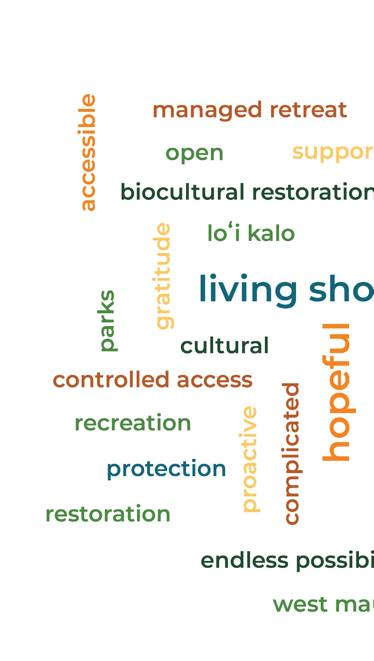 Written responses from the Resilient Future: Coastal Interventions activity reveal a strong emphasis on ecological restoration, expanding parks and open spaces for recreation, and removing the existing highway. Participants frequently highlighted opportunities to enhance coastal resilience and public access. The five most commonly used words were: highway (12), remove (8), park (7), Ukumehame (6), and beach (6), reflecting key priorities in re-imagining the coastal area.