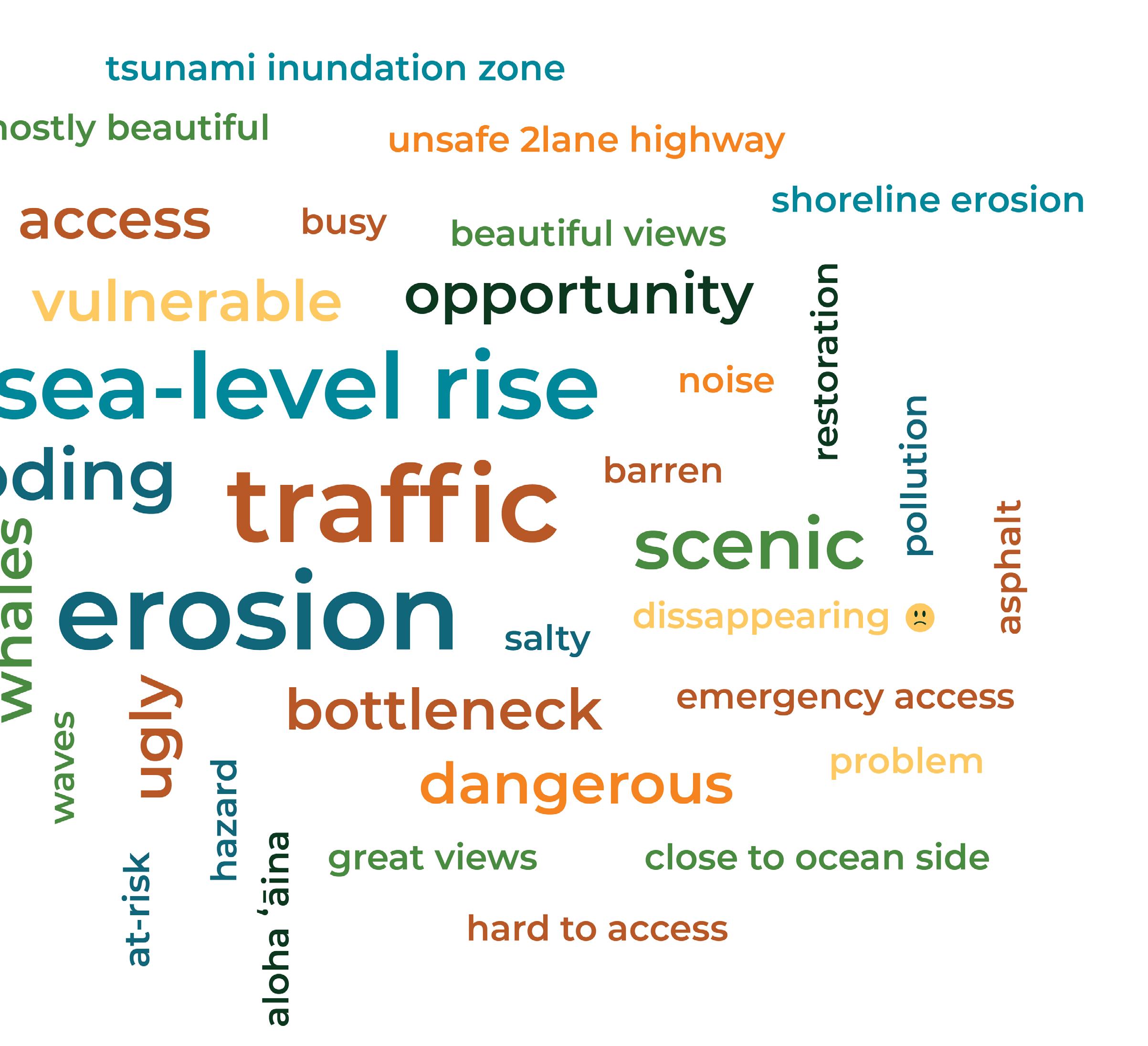 The resulting word cloud visually summarizes the collective sentiment from both in-person and virtual participants. In the graphic, larger words indicate more frequent mentions, illustrating key themes. The responses revealed a shared vision for resilience, sustainability, and the opportunity that the relocation of the Honoapiʻilani Highway brings.