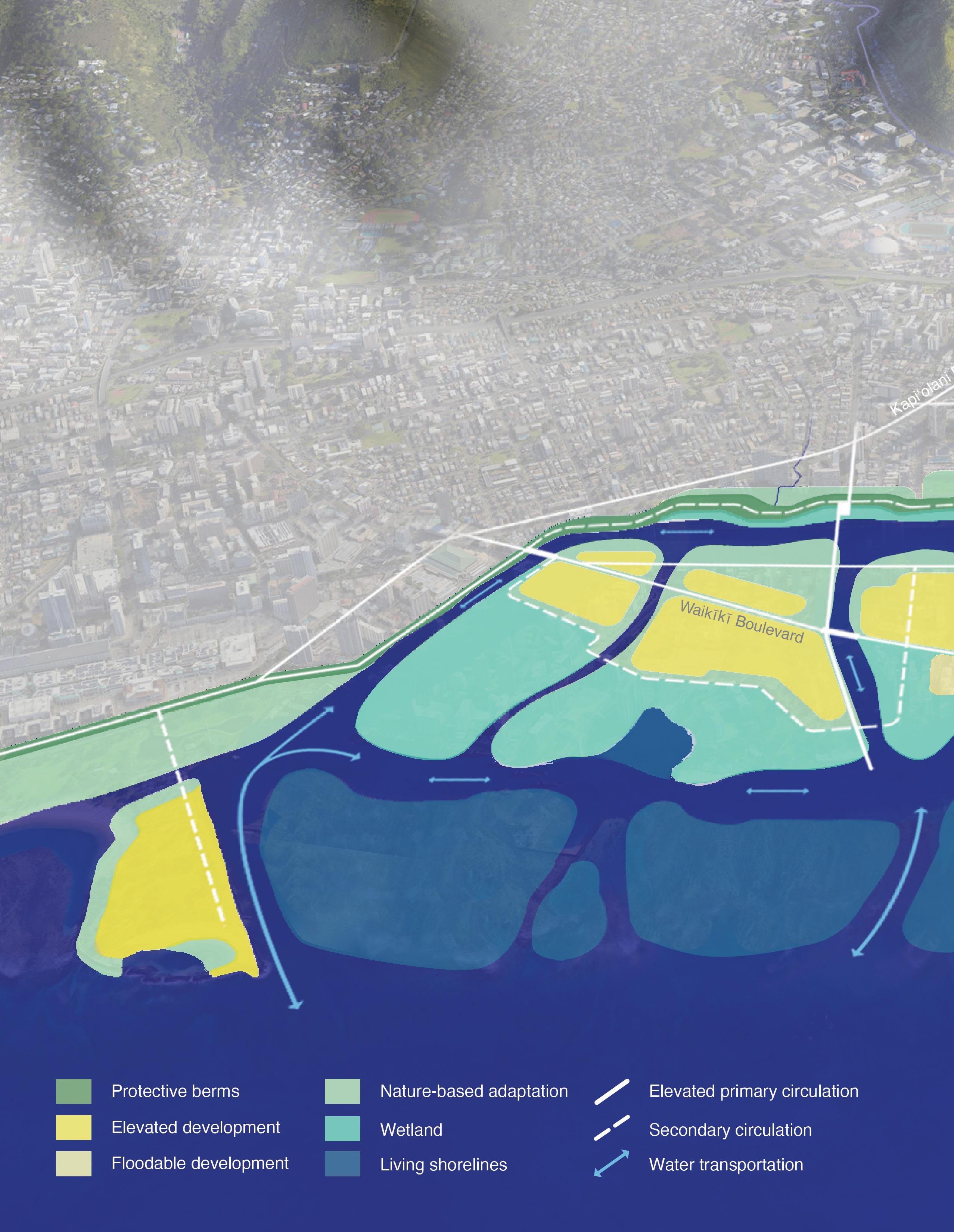 This work intends to further the discourse on a future vision for a resilient Waikīkī. It does not represent planning documents.
