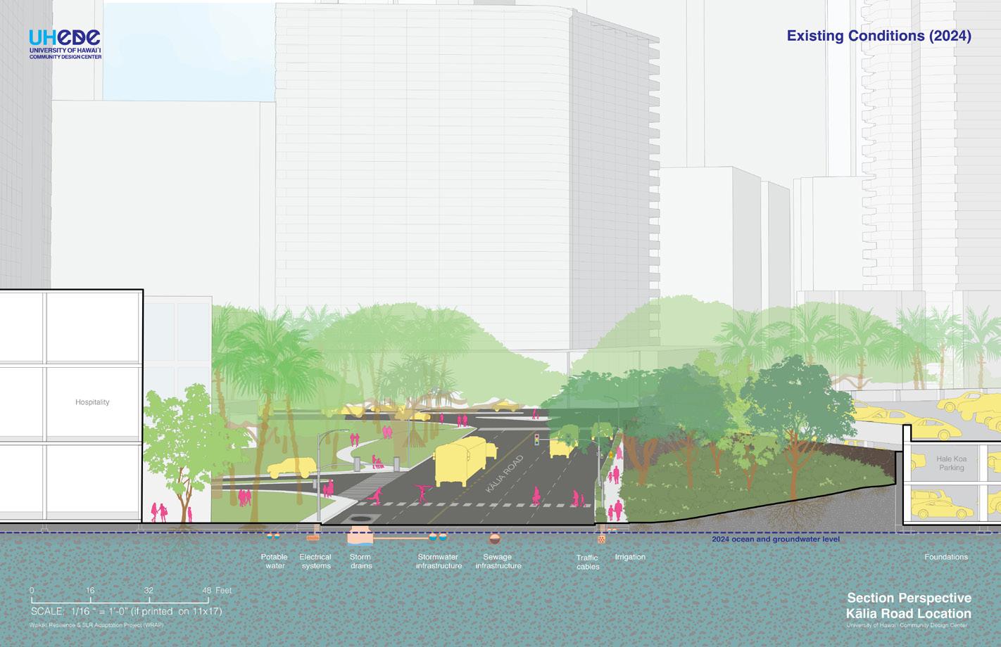 In the Kālia Road Location, the section perspective drawings illustrate how a roadway that is currently already affected by nuisance flooding during heavy rain events is envisioned to be replaced with an elevated, multi-modal transportation, circulation, and infrastructure system.