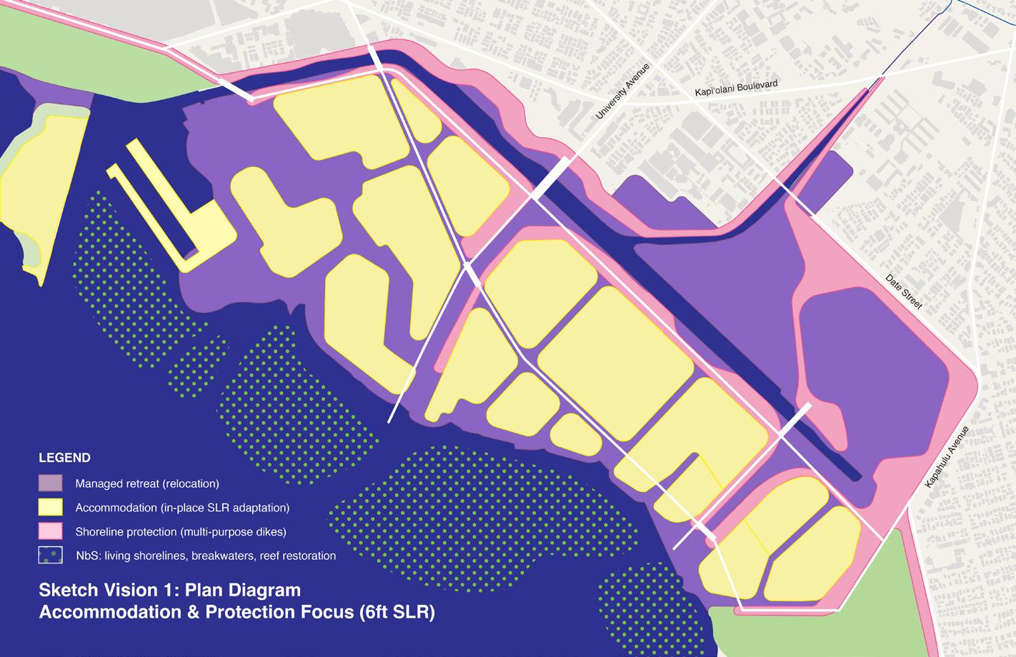 A long-term resilient Waikīkī will integrate wide, multipurpose dikes with nature-based adaptation solutions, such as floodable green spaces that provide ecosystem services and layered coastal protection systems, e.g., living breakwaters, engineered coral reef ecosystems, fish ponds, etc Nature-based solutions should take inspiration from, and incorporate, native Hawaiian traditional ecological knowledge and biocultural practices.