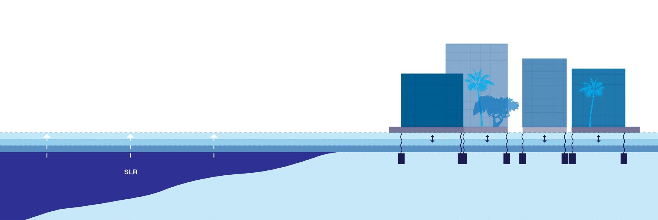 Structures and landscapes designed to withstand inundation with habitable space, critical assets, and vulnerable infrastructure on upper levels or at higher elevations decrease hazard risks and increase resilience to the impacts of sea level rise and flooding.