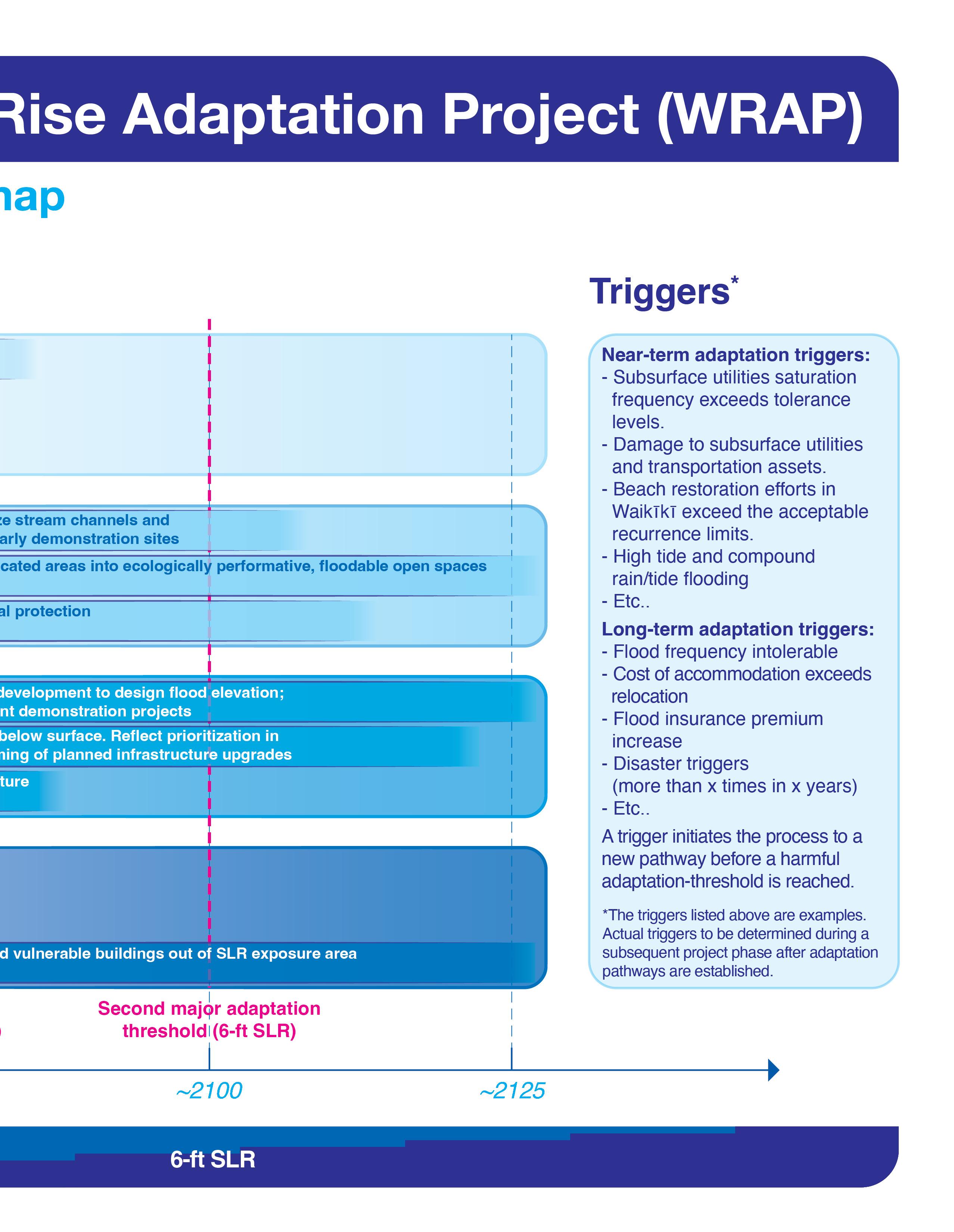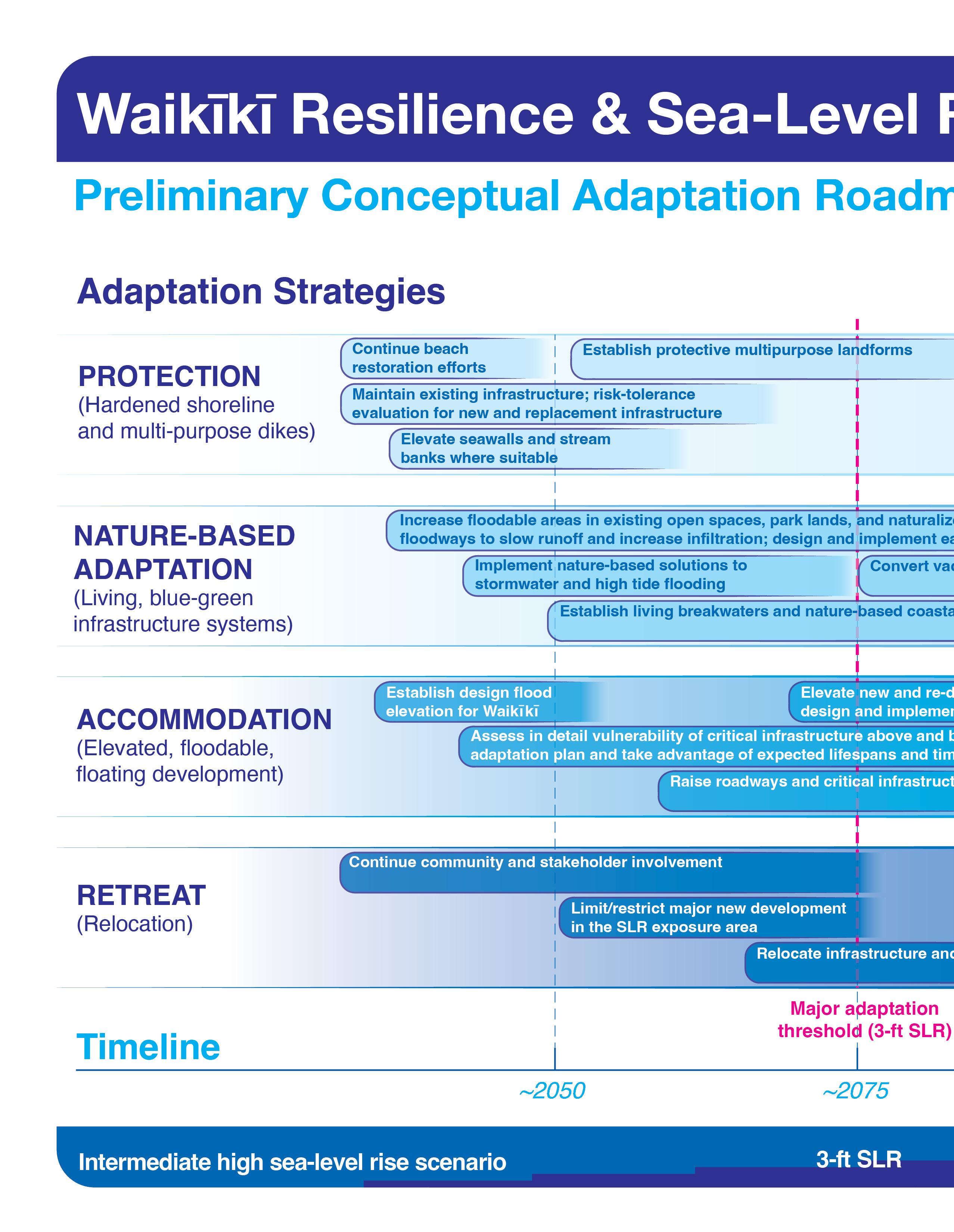As existing buildings, transportation facilities, infrastructure elements, and underground utilities reach the end of their lifespan, a range of sea-level rise adaptation strategies need to be considered. Methods applicable to a densely developed urban area such as Waikīkī are summarized on the following page.