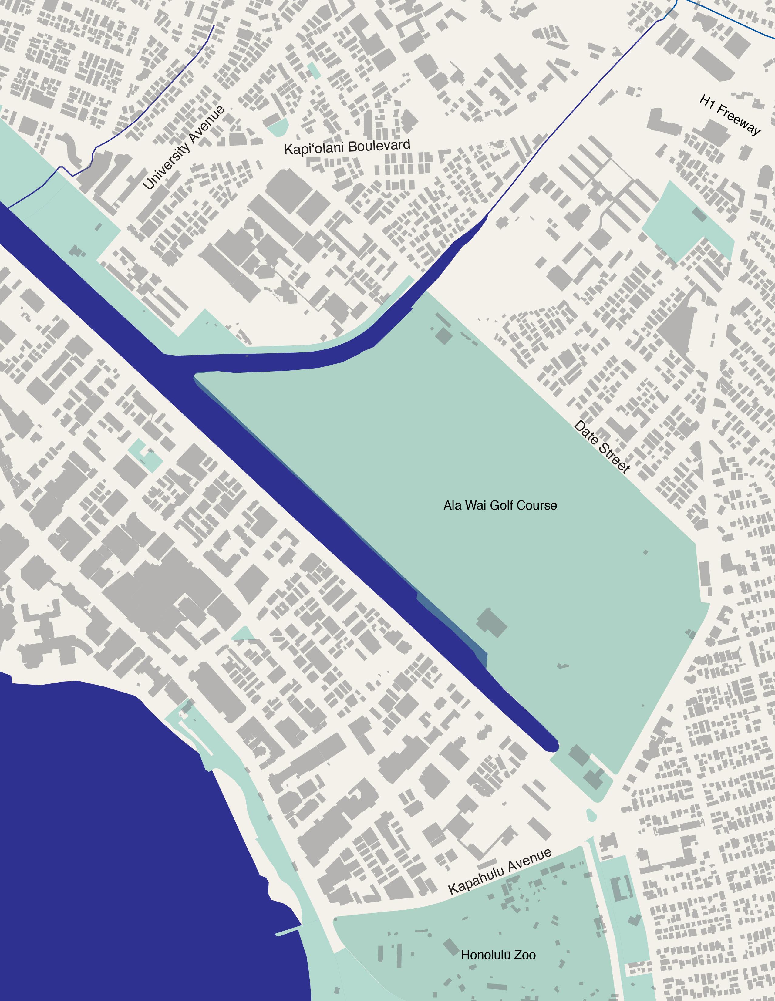 As existing subsurface systems for stormwater and sewage management begin to fail, future elevated and floodable development in Waikīkī will need to rely increasingly on surface drainage and canals. Other underground utilities (e.g., electrical, communications, potable water) will need to be off-grid and elevated along with future building and infrastructure contruction.