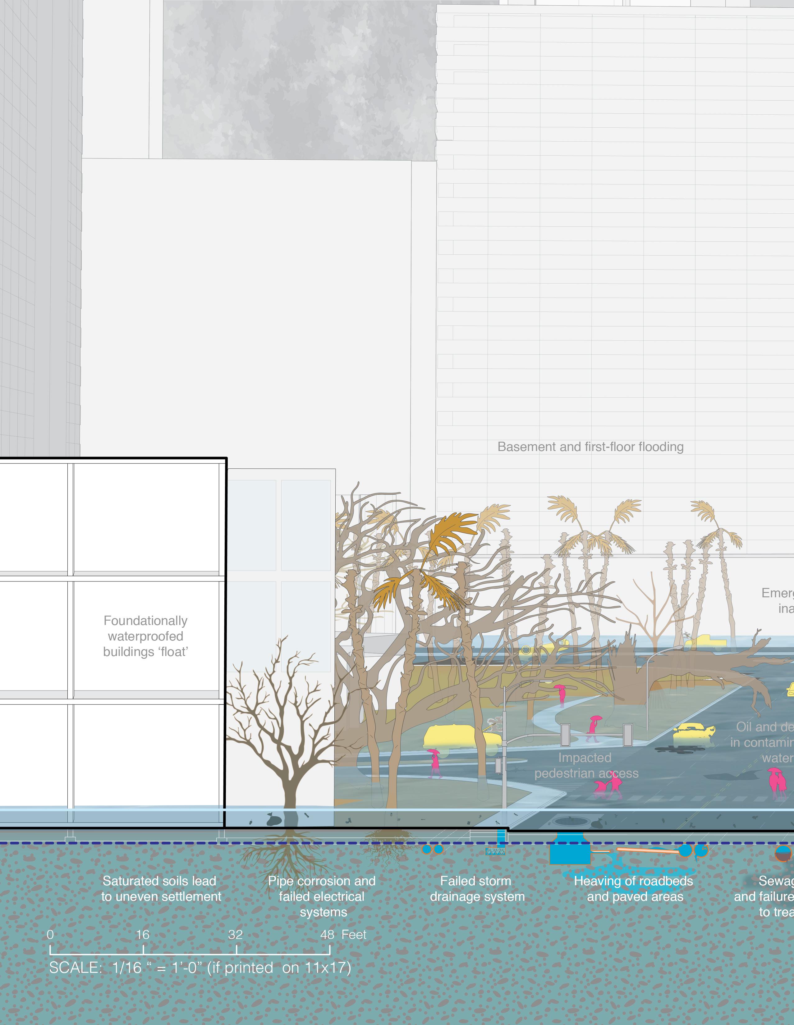 In both sketch visions, below-ground utilities—already impacted by the current groundwater table in this location—are proposed to be elevated along with new buildings. Water-based transportation and autonomous electric transit replaces individual automobiles.
