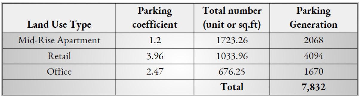 Parking generation estimates are calculated using the build-out scenario and are done using generation parking coefficients from the Institute of Transportation Engineers (ITE) Parking Generation Report, the 4th edition. The parking generation numbers would most likely be much lower in reality, especially in a TOD where the parking requirements are reduced if not eliminated. However, it is still relevant to get estimates of parking generation given a maximum build-out scenario. It is assumed that future apartment buildings would have mid-rise characteristics in an urban setting. This coefficient came out to be 1.2 parking stalls per dwelling unit. The shopping coefficient of 3.96 per 1000 sqft was used to calculate the parking generation of retail. This coefficient is likely much larger than what would be present in a TOD. However, for compar ative purposes and lack of data to a more accurate coefficient, 3.96 is still used for the parking generation calculations. The number of parking stalls generated in an urban office building is 2.47 stalls per 1000 sqft. For the elementary school in parcel 4, an estimate of the number of students in the school is based on how many students were in a school of similar size. Manoa elementary school, which contains about 550 students, was used in this case and generates 0.17 per student. Finally, the library generates 0.42 stalls per sqft in urban areas.