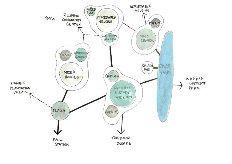 In a transit-oriented development (TOD), placemaking centers around a high-quality pedestrian experience in a mixed-income and mixed-use environment with less dependence on vehicles. Placemaking can emphasize a community’s strength and character, building on social capital as well as environmental and cultural capital. The practicum reviews the role of placemaking in increasing environmental, cultural, and social capital by paying particular attention to community needs, and City and State TOD goals. From our research and community input, we learned that Waipahu is lacking in equity, safety, and health. Residents desire safer green spaces and in creased walkability. To have access to healthy, fresh food, education on growing vegetables with aquaponics, and local art to uplift Waipahu and give residents a sense of belonging, a positive sense of place.