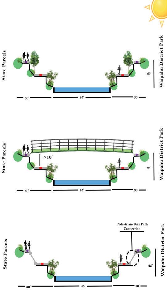 The Waipahu Depot Street, which runs parallel to the Kapakahi stream, has 2-way traffic lanes as well as lanes for street parking on both sides. It is recommended that removal of street parking take place in this location as well as consolidating the traffic flow into the two easternmost lanes. This extra space would allow for the steam to be widened and develop a riparian zone at the stream’s perimeter. The pedestrian greenway could then be expanded along this transect to provide pedestrian access to the Pouhala Marsh.