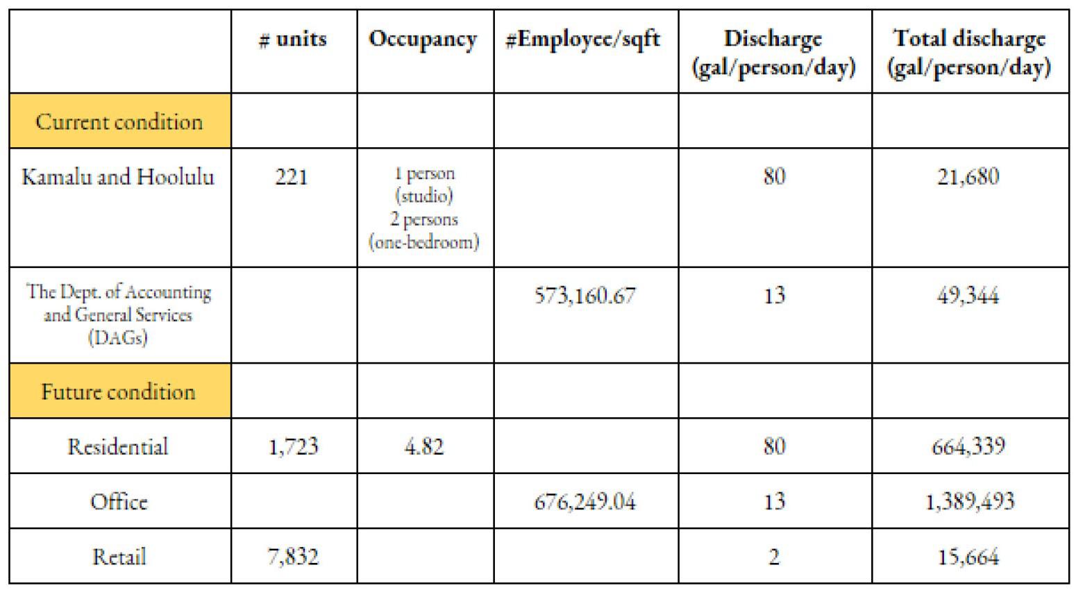 Modification (1995), the pump station can only accommodate flows up until the year 2020. Currently, the sewer system is adequate for a population of about 198,000 people within Central Oʻahu, and 28,000 of those customers are from Waipahu. Currently, in the state parcels, there are 16 sewer mains with diameter ranges from 8 to 24 inches, 2 sewer laterals with a diameter of 6 inches, and 13 sewer manholes. The volume for sewer mains is 16 times of the lateral, and suppose the laterals are not enough to accommodate current usage, then it is quite likely that the sewer mains could not meet the needs for future development. There are implications from the proposed development in Waipahu; it will likely to contribute to 28.8 times greater than the currently generated wastewater. The density changes in the TOD area are also expected to result in increased wastewater flows, which will necessitate needed upgrades to the pump station.