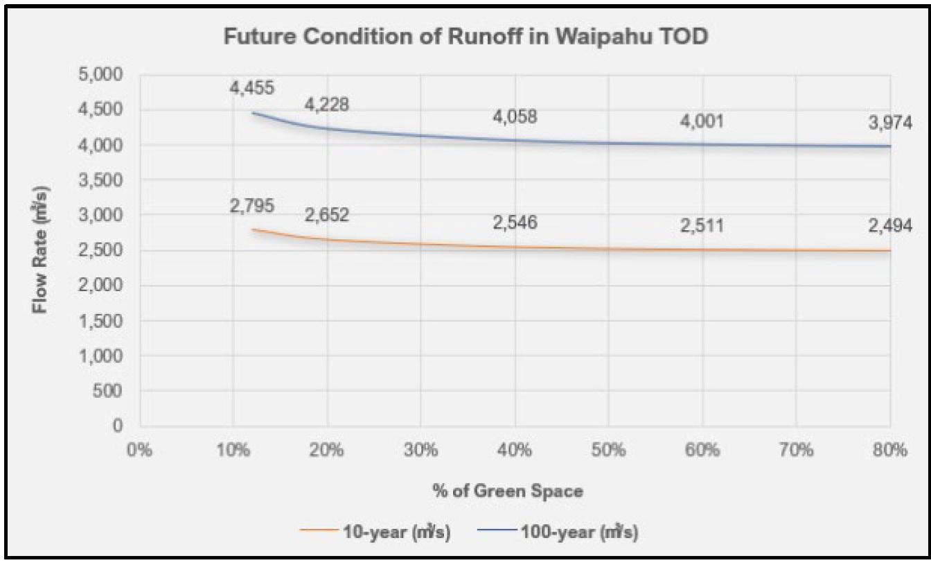 the issue; if the 12% of green space is added to the current TOD zoning, approximately 2,795 m3/s is expected to be generated during the 10-year return period. In order to keep the flow rate at the current level, the future estimation encourages the zoning to set aside ≥ 80% of the devel opment as green space (see figure 3).
