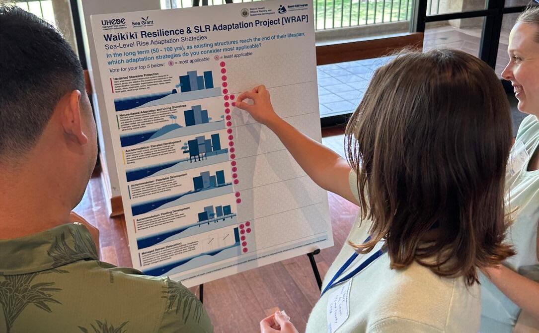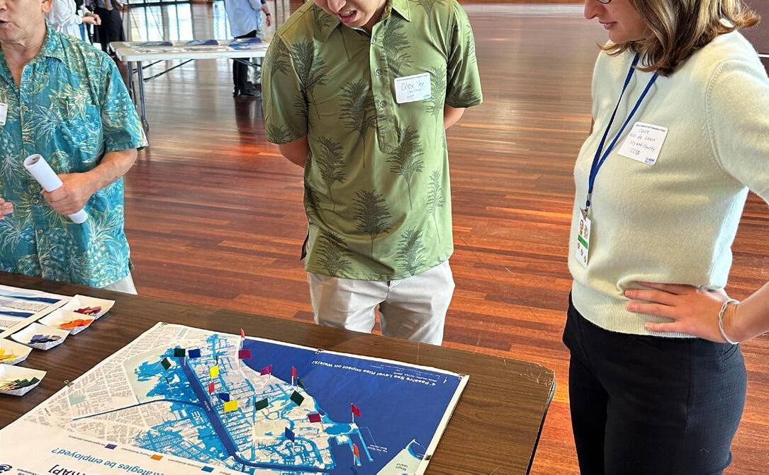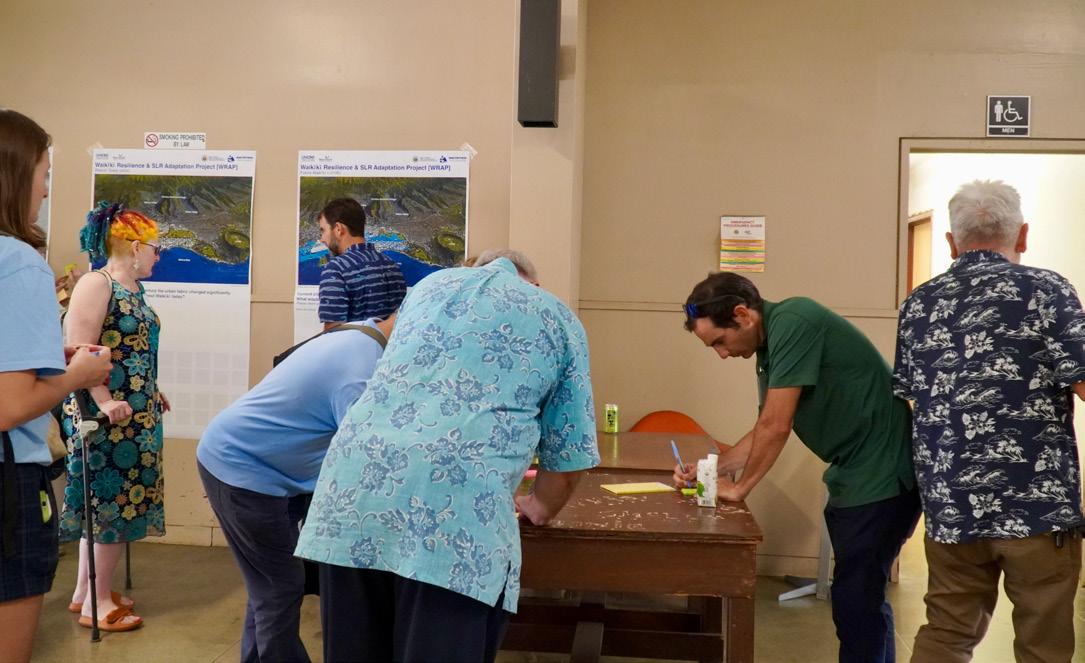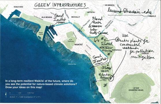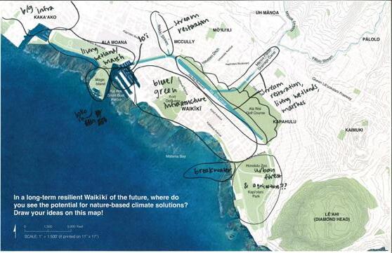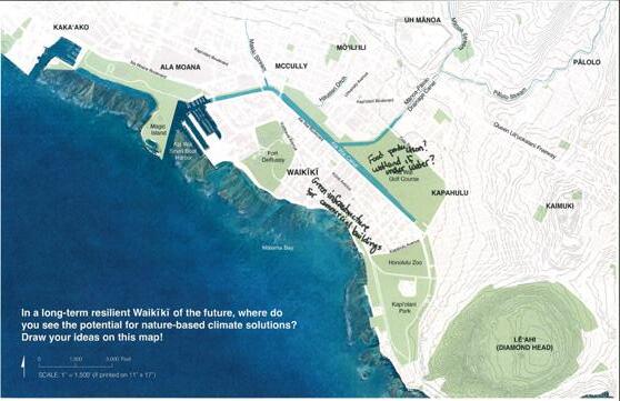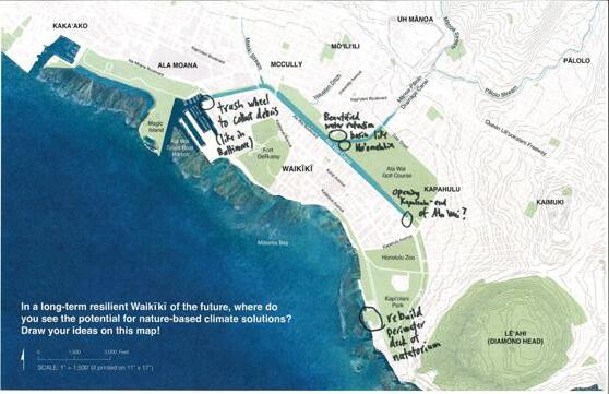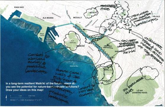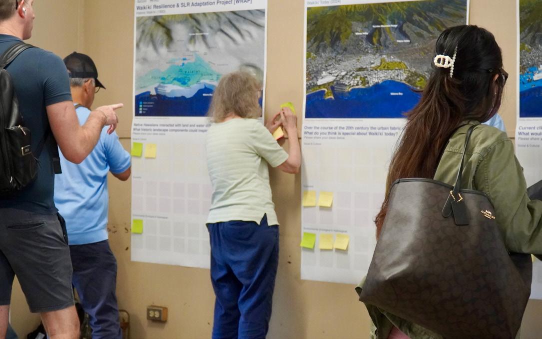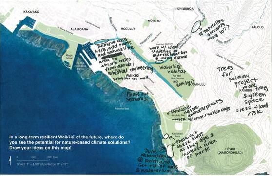 WRAP team members encouraged community members and stakeholders to annotate and draw locations where they think nature-based climate adaptation solutions should be used in and around a future Waikīkī.
