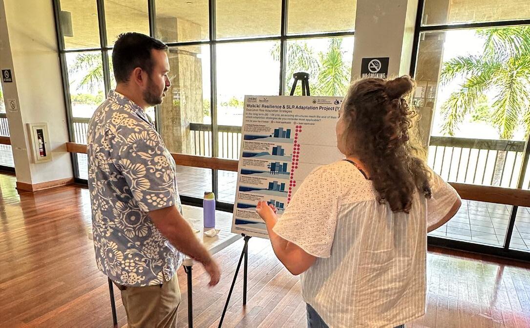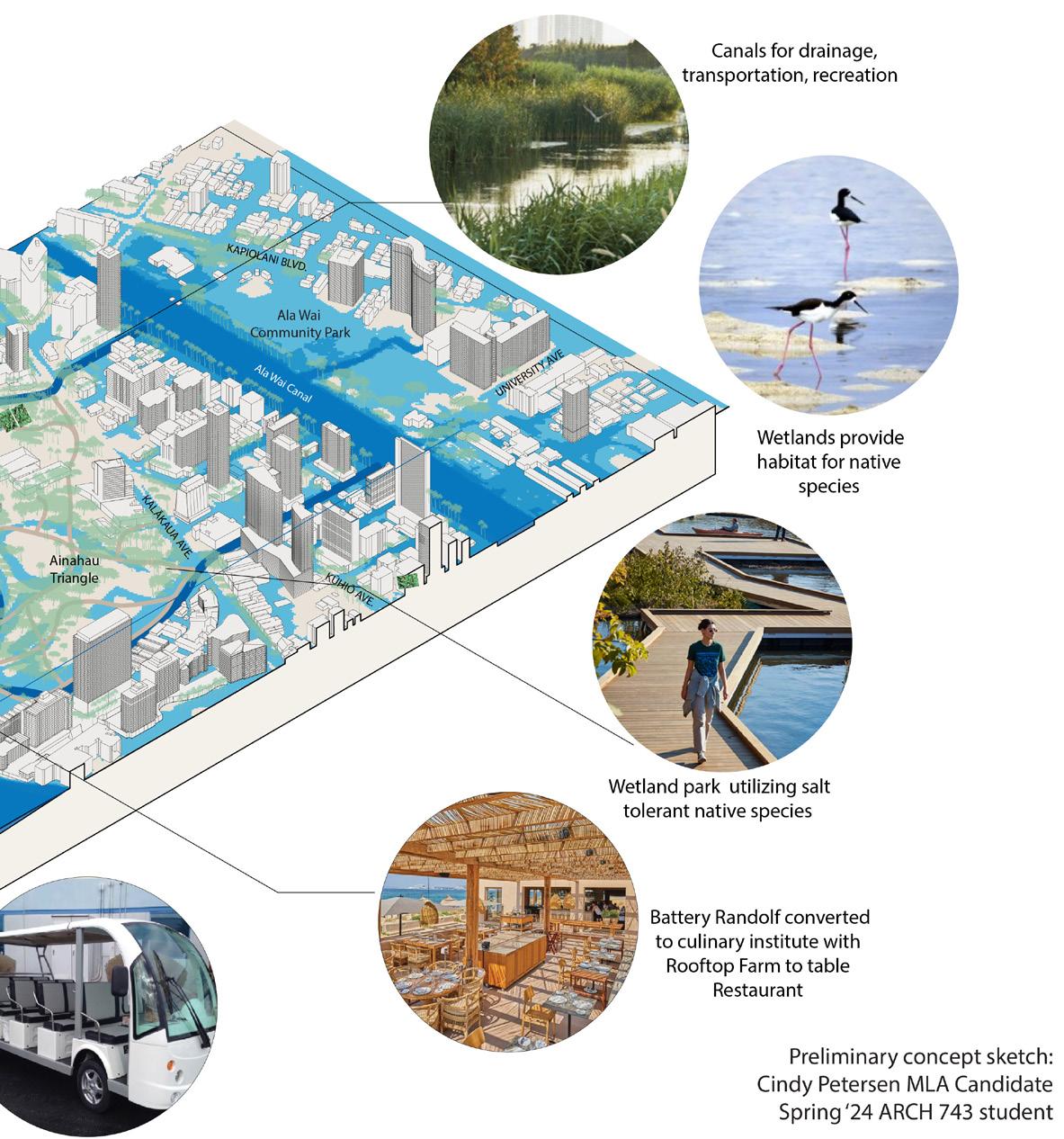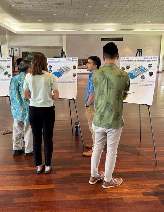 The exercises posed questions related to sea-level rise adaptation strategies, building stock vulnerabilities, and long-term ideas for resilience. The charrette also included speculative student work from UHM’s Spring ‘24 ARCH 743 urban design studio course.