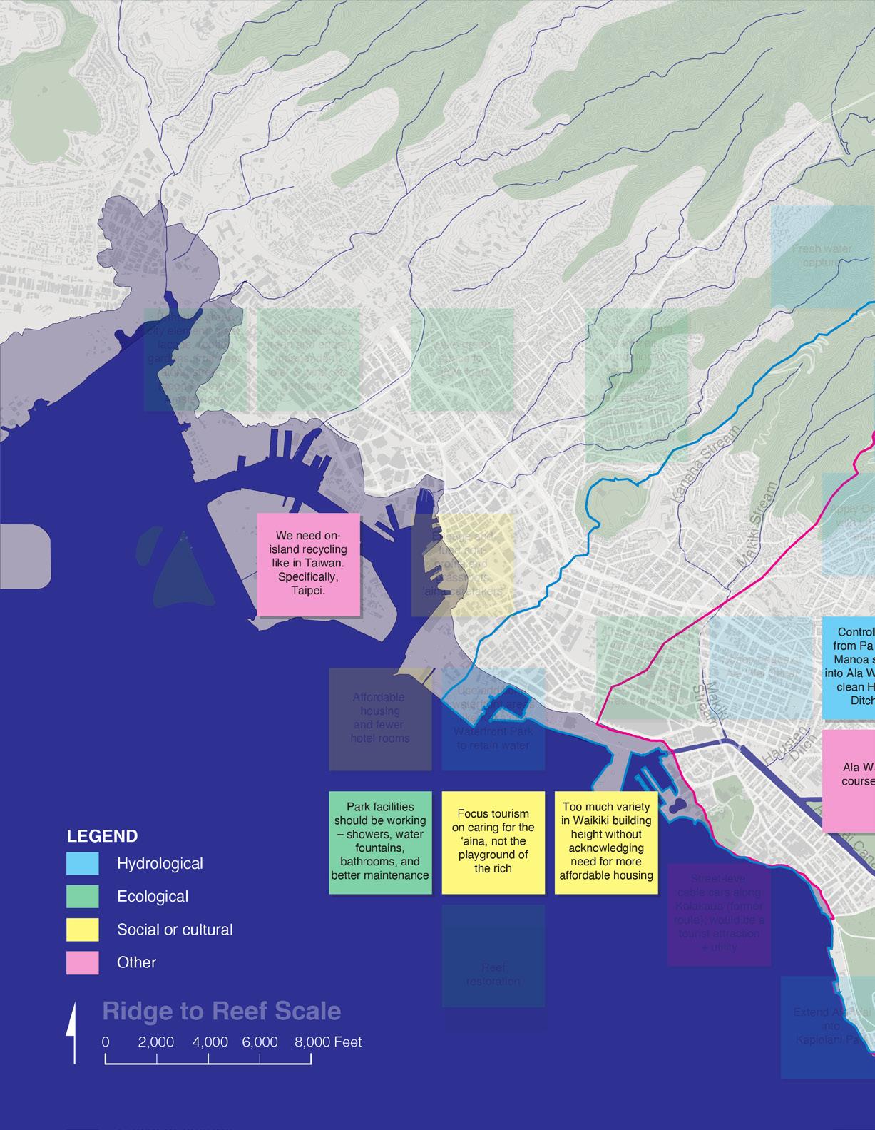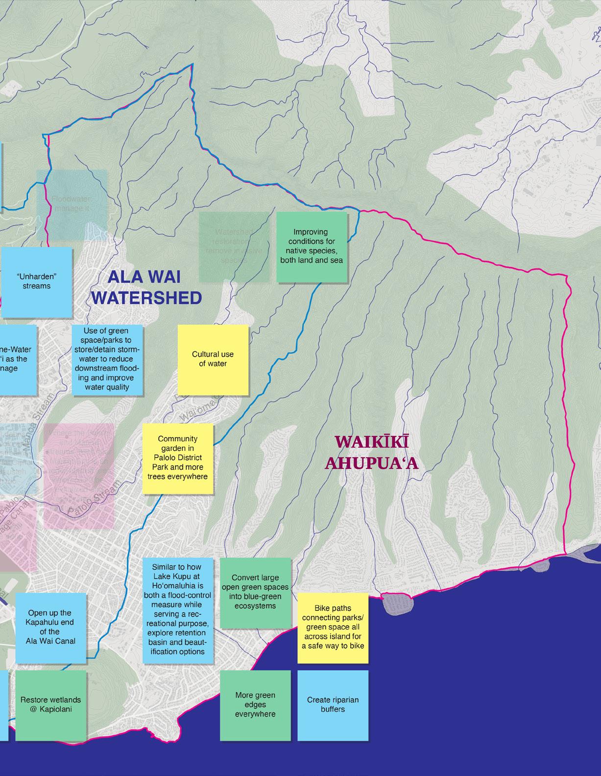 were meant to be categorized and color coded by ideas related to the following themes: social & cultural factors, economic factors, and environmental (ecological and hydrological) factors. The activity intended to gather additional, broad community input on a vision for a long-term resilient, climateadapted Waikīkī within its context.