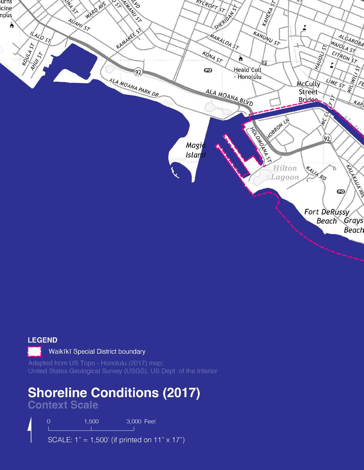 Mapping and diagramming of select site conditions and hazards at watershed/ahupua’a scale (ridge to reef), Waikīkī context scale (including areas immediately mauka of Ala Wai Canal and Kapiolani Park context) and Waikīkī Special District scale.