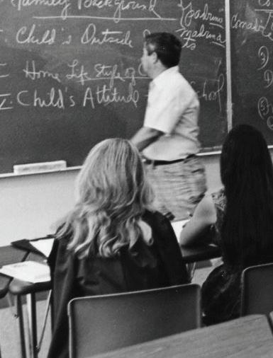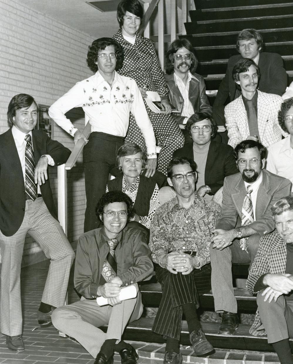 artist Pablo Serrano on the lawn facing the Bayou Building. A surge in student enrollment followed in the fall of 1978 when a record-breaking 5,518 students registered for classes.