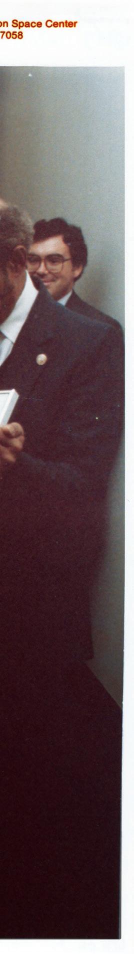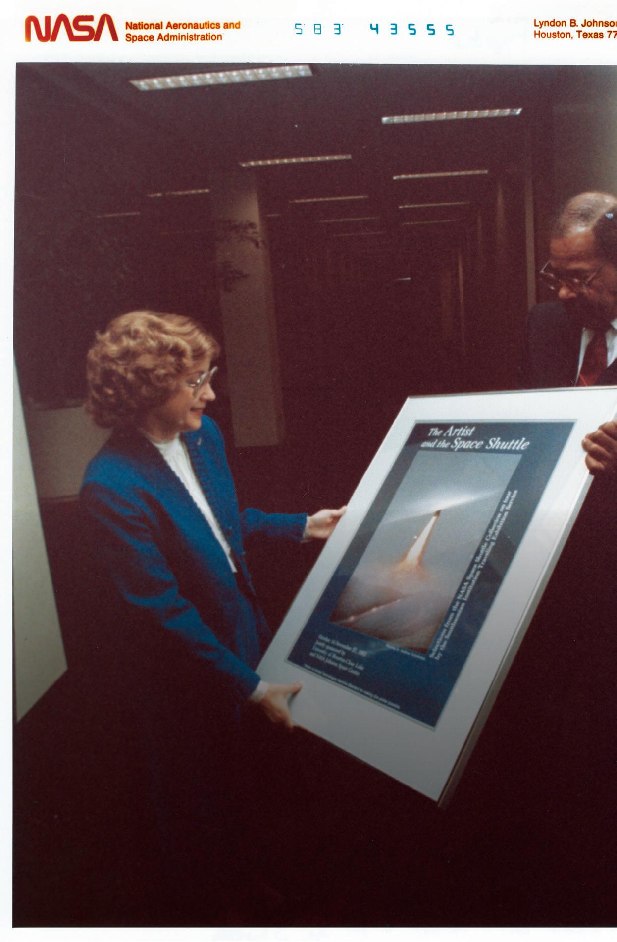 1983 | Official NASA Johnson Space Center photograph of Houston Mayor Kathy Whitmire holding a framed poster of the joint UHCL and NASA Johnson Space Center program The Artist and the Space Shuttle, along with an unknown NASA official