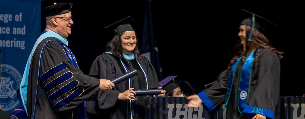 On behalf of the entire University of Houston-Clear Lake community, I extend my warmest congratulations to you on this momentous occasion. Today not only marks the culmination of years of hard work, dedication, and sacrifice, but it also occurs at a particularly historic moment as we celebrate the 50th anniversary of our esteemed institution. It is an honor to celebrate both this significant milestone in your lives and a half-century of transformative education at UHCL.