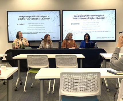 “Intergrating AI into the Future of Higher Education” panel discussion held in the Hawk’s Overlook in April 2024. Hosted by the Neumann Library, Center for Faculty Development and the College of Human Science and Humanities (Beth Fridrick far left)