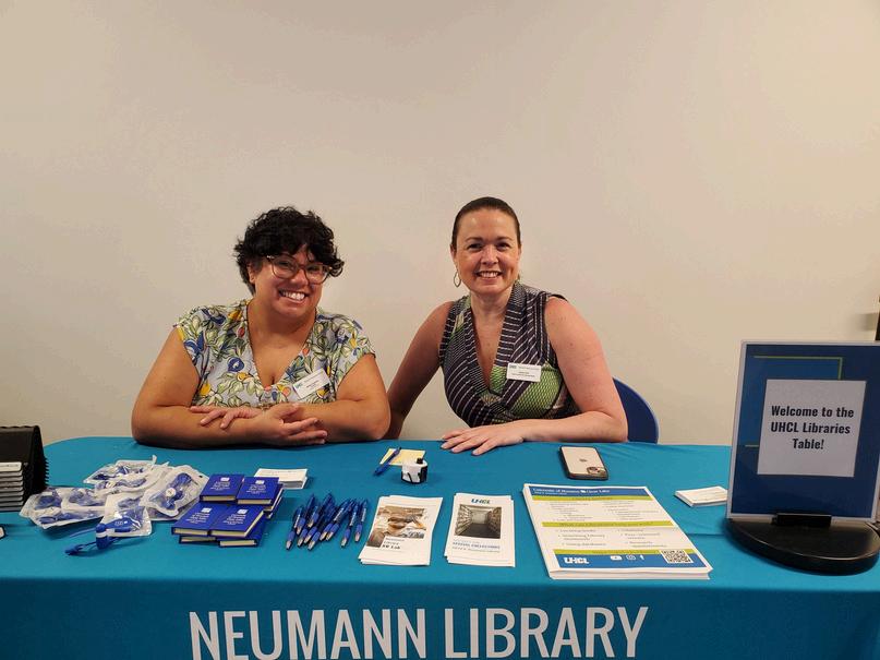 Juliana Espinosa & Linsey Ford promoting library services at the UHCL Hawk Preview held at the Texas Medical Center in July