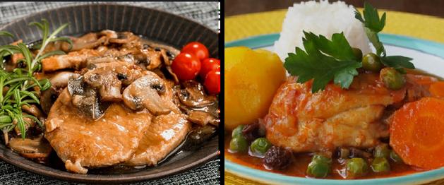 Estofado de pollo arroz al azafrán papas al vapor ensalada verde