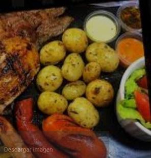 Corte maduro de res (bife de chorizo) a la parrilla con morcilla, chorizo y longaniza papas al gratín ensalada de vainita, choclo y tomate a la miel y mostaza