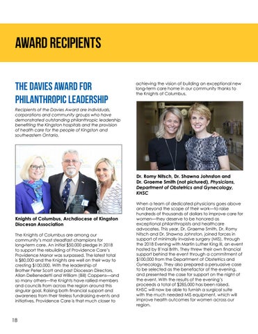 Recipients of the Davies Award are individuals, corporations and community groups who have demonstrated outstanding philanthropic leadership benefiting the Kingston hospitals and the provision of health care for the people of Kingston and southeastern Ontario.