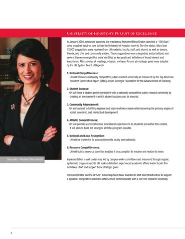 University of Houston’s Pursuit of Excellence In January 2008, when she assumed the presidency, President Renu Khator launched a “100 Days” drive to gather input on how to help the University of Houston move to Tier One status. More than 12,000 suggestions were received from UH students, faculty, staff, and alumni, as well as donors, friends, and civic and community leaders. These suggestions were categorized and prioritized, and several themes emerged that were identified as key goals and initiatives of broad interest and importance. After a series of meetings, retreats, and open forums six strategic goals were adopted by the UH System Board of Regents: 1. National Competitiveness: UH will become a nationally competitive public research university as measured by the Top American Research Universities Report (TARU) and/or Carnegie Foundation for the Advancement of Teaching. 2. Student Success: UH will have a student profile consistent with a nationally competitive public research university by creating an environment in which student success can be ensured. 3. Community Advancement: UH will commit to fulfilling regional and state workforce needs while becoming the primary engine of social, economic, and intellectual development. 4. Athletic Competitiveness: UH will provide a comprehensive educational experience to its students and within this context, it will seek to build the strongest athletics program possible. 5. National and Local Recognition: UH will be known for its accomplishments locally and nationally. 6. Resource Competitiveness: UH will build a resource base that enables it to accomplish its mission and realize its vision. Chancellor / President Renu Khator