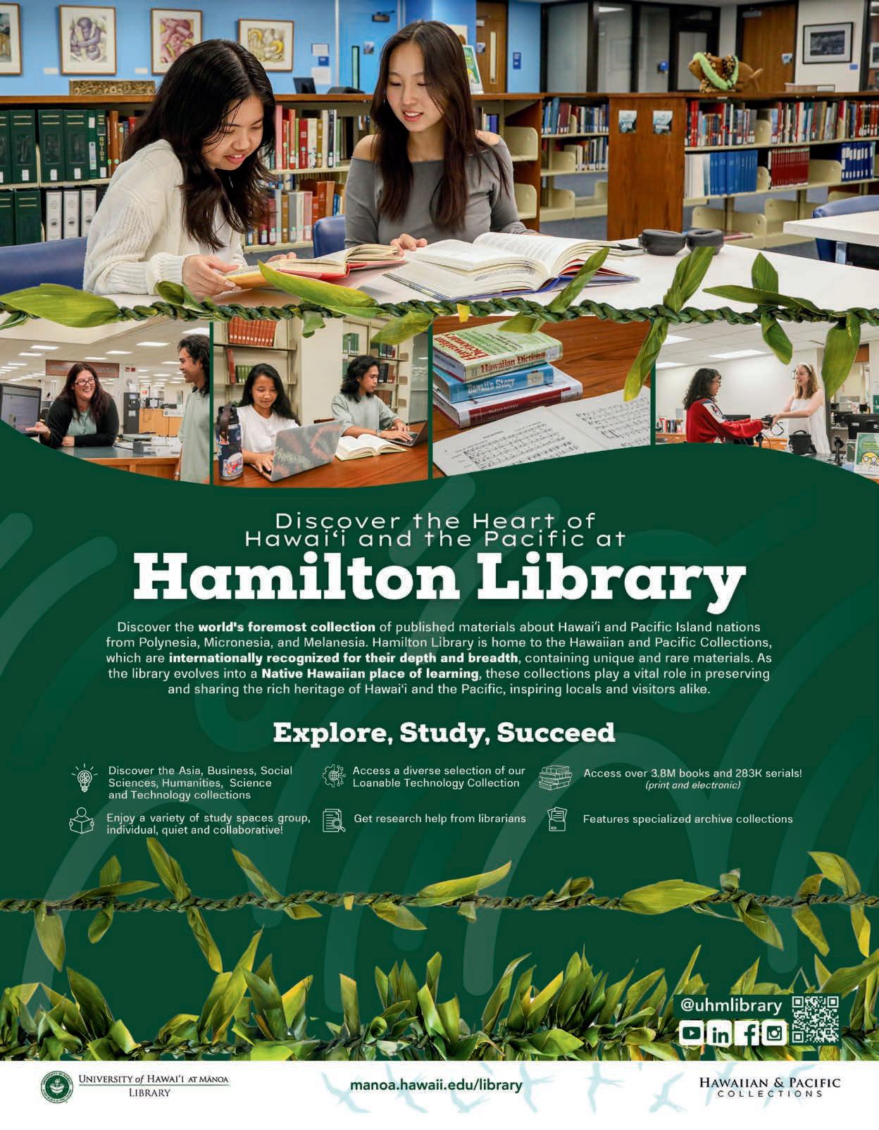 HAMILTON LIBRARY offers resources, services, and expertise to facilitate discovery and the exchange of information. The library also serves as an intellectual, cultural, and social hub for UH Manoa and the larger community. Library collections include over three million volumes together with microform units, digital files, manuscripts and archives, audiovisual materials, maps and aerial photographs, and current journals and serial titles in paper and electronic formats.