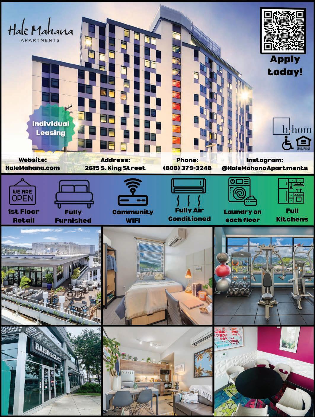 This new complex, near the corner of Dole St. and EastWest Rd., is scheduled to open in Fall 2025, and will include furnished apartments with in-unit kitchen and bathroom. This facility offers study lounges, coffee station, rooftop terrace, bike storage, and a childcare center.