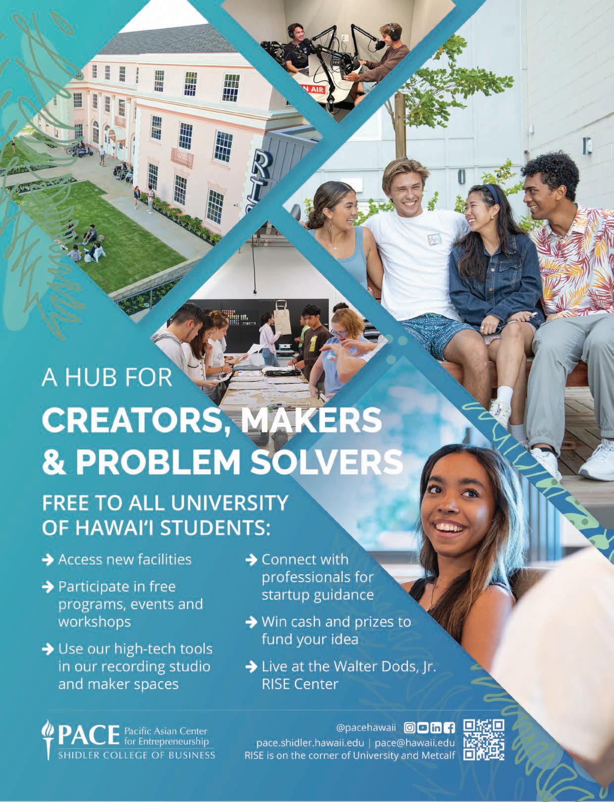 Home to 374 students, RISE features dormitory-style housing and a vibrant environment designed to support innovation and collaboration. Amenities include in-unit air conditioning, an outdoor deck with BBQ grills, secure bike and surfboard storage, a recording studio, makerspaces, coworking areas, and fully equipped meeting rooms. -> www.risemanoa.com